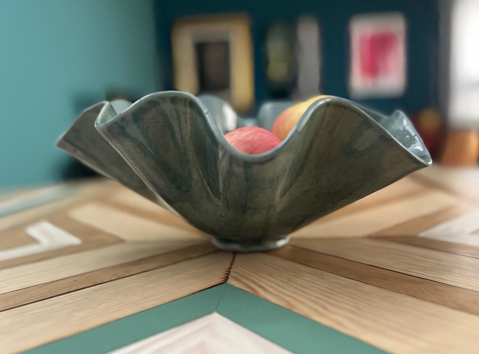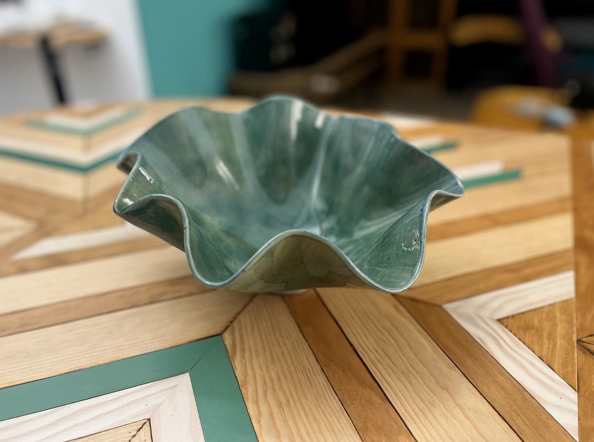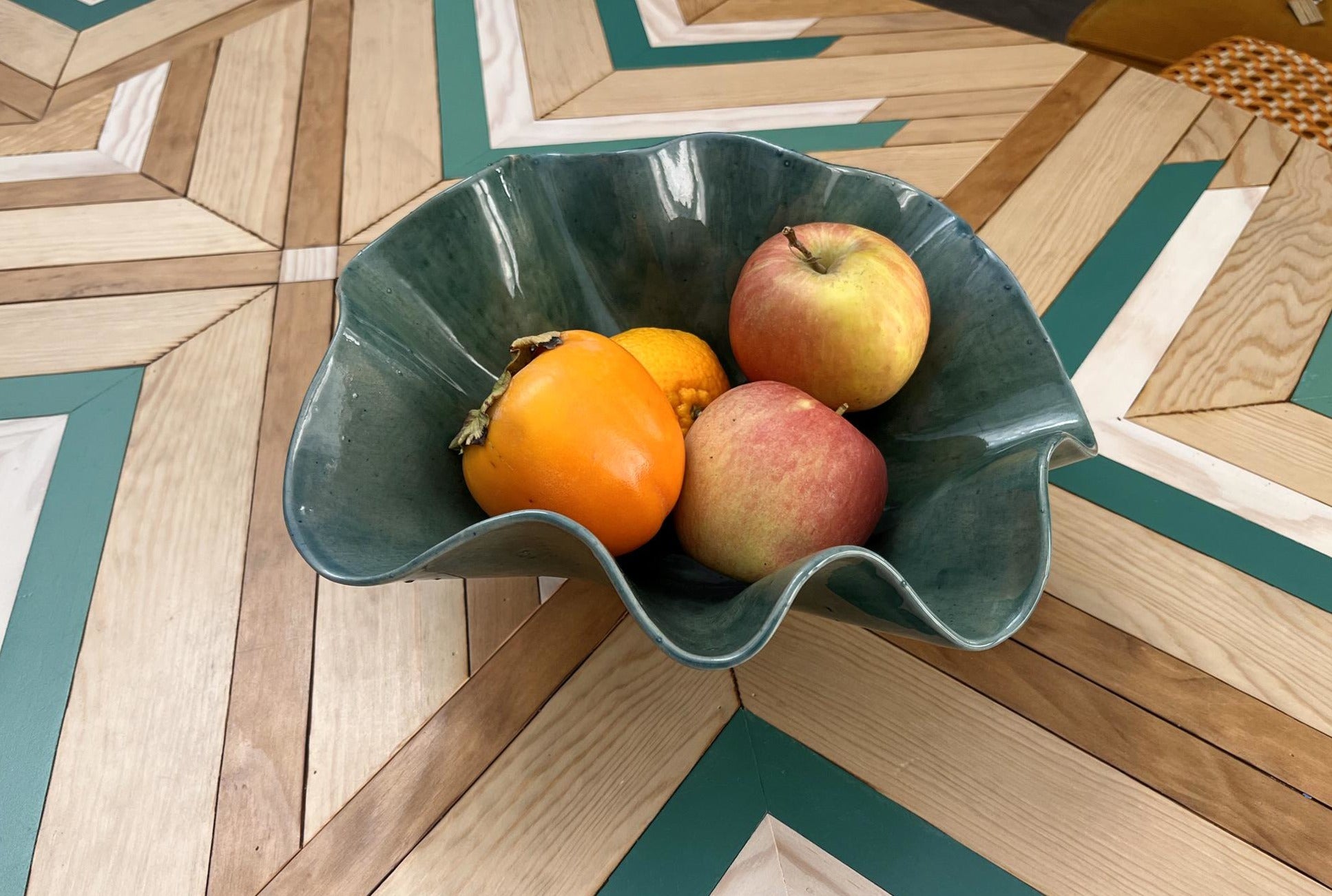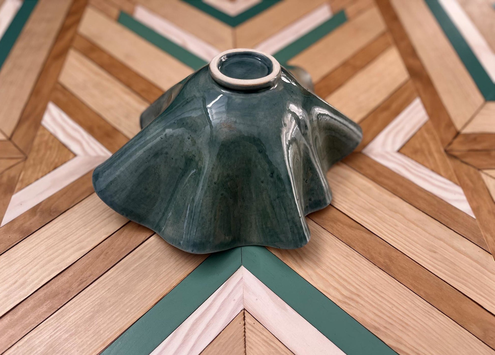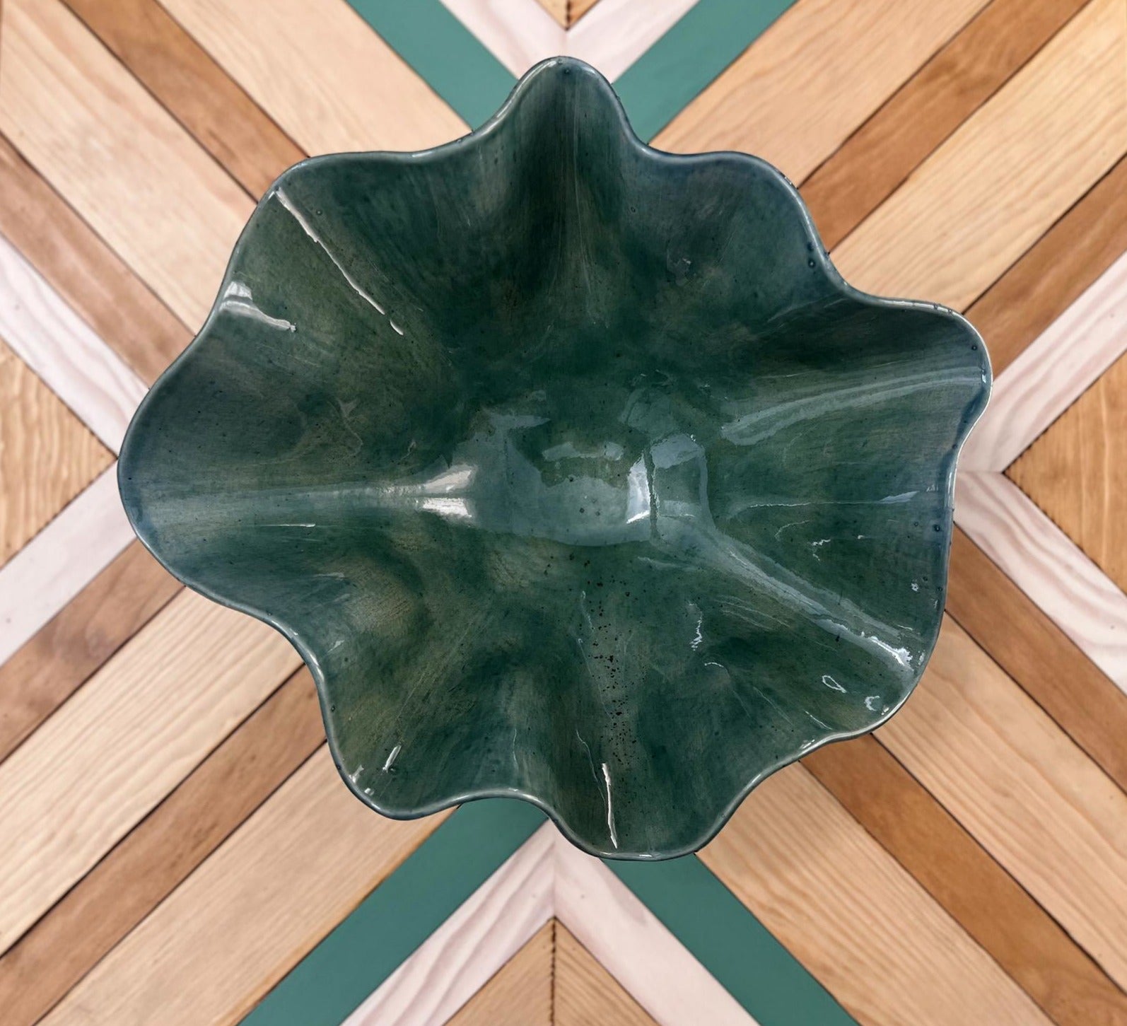 Este cuenco de cerámica está realizado a mano y se caracteriza por su forma ondulada e irregular, que aporta movimiento y organicidad a la pieza. El esmalte, en tonos verdes, realza las curvas y genera variaciones sutiles que hacen que cada cuenco sea único.