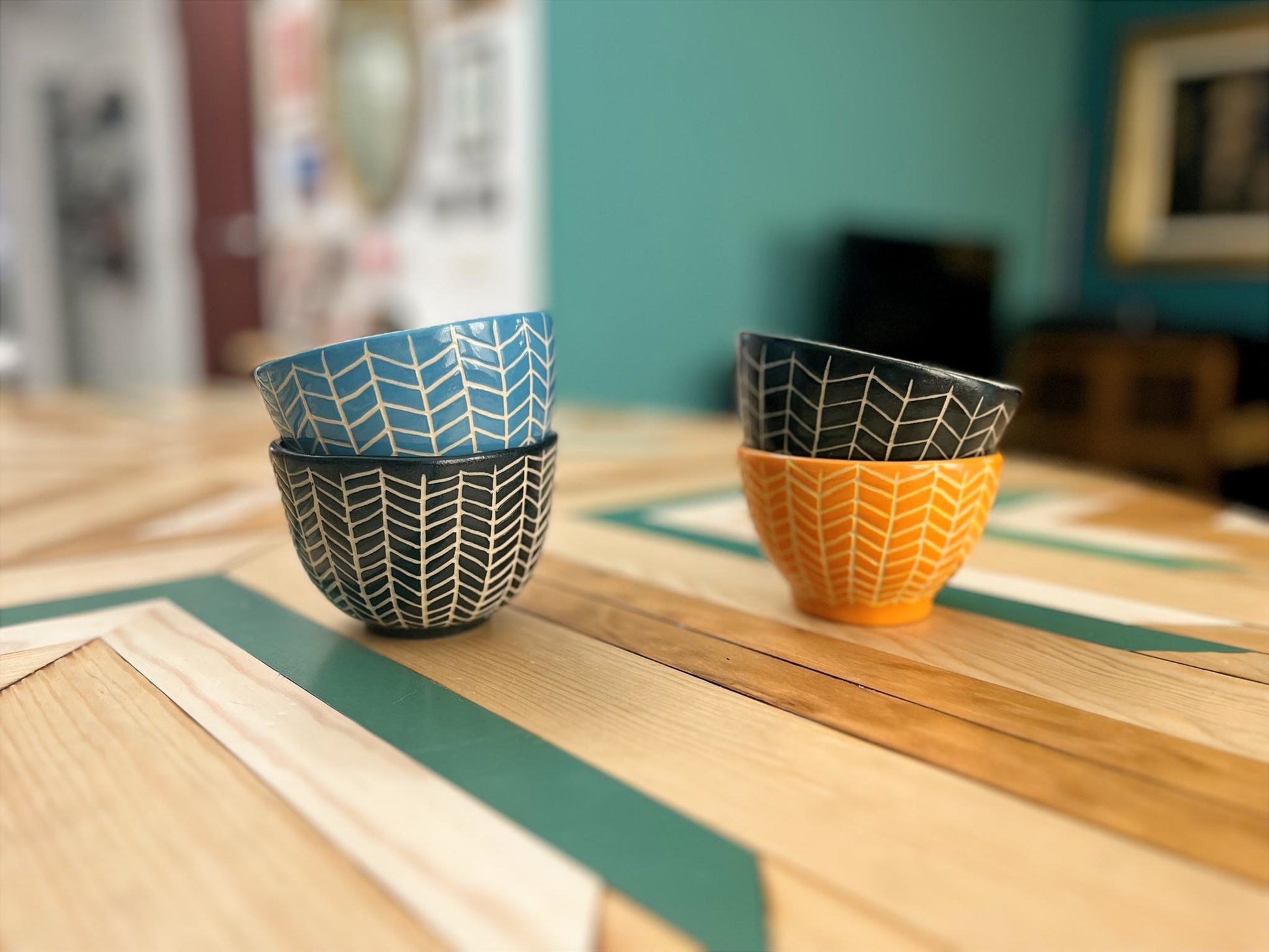 Cuenco de cerámica artesanal realizado a mano y decorado mediante la técnica del esgrafiado. El patrón geométrico se repite de forma regular sobre la superficie, creando un ritmo visual que aporta carácter y equilibrio a la pieza.
