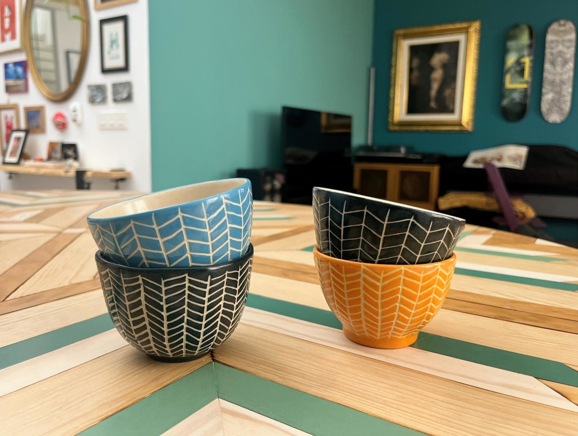 Cada cuenco está esmaltado en un color distinto, lo que permite combinarlos entre sí o utilizarlos como piezas individuales. El interior cuenta con esmalte transparente, que protege la superficie y deja ver la textura natural del gres.