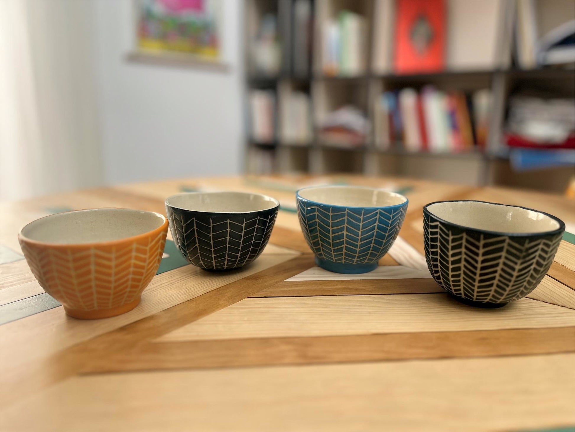 Cuenco de cerámica artesanal esgrafiado con patrón geométrico
