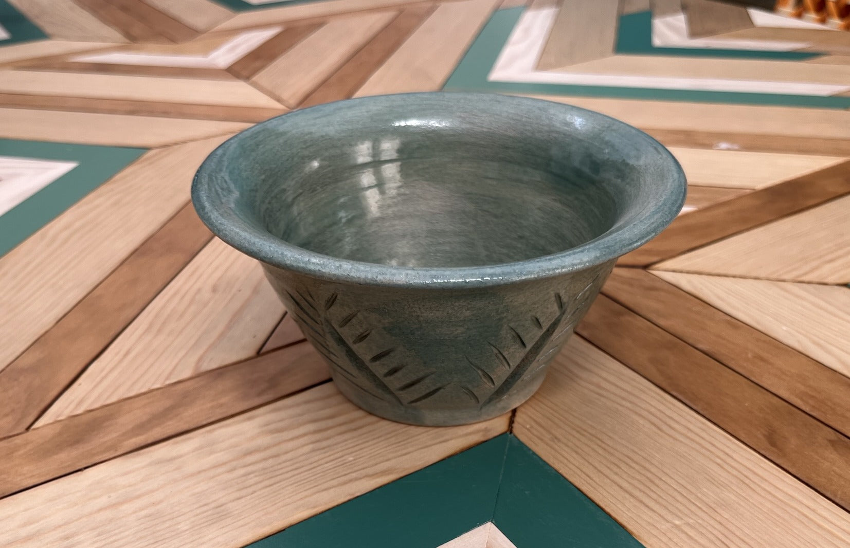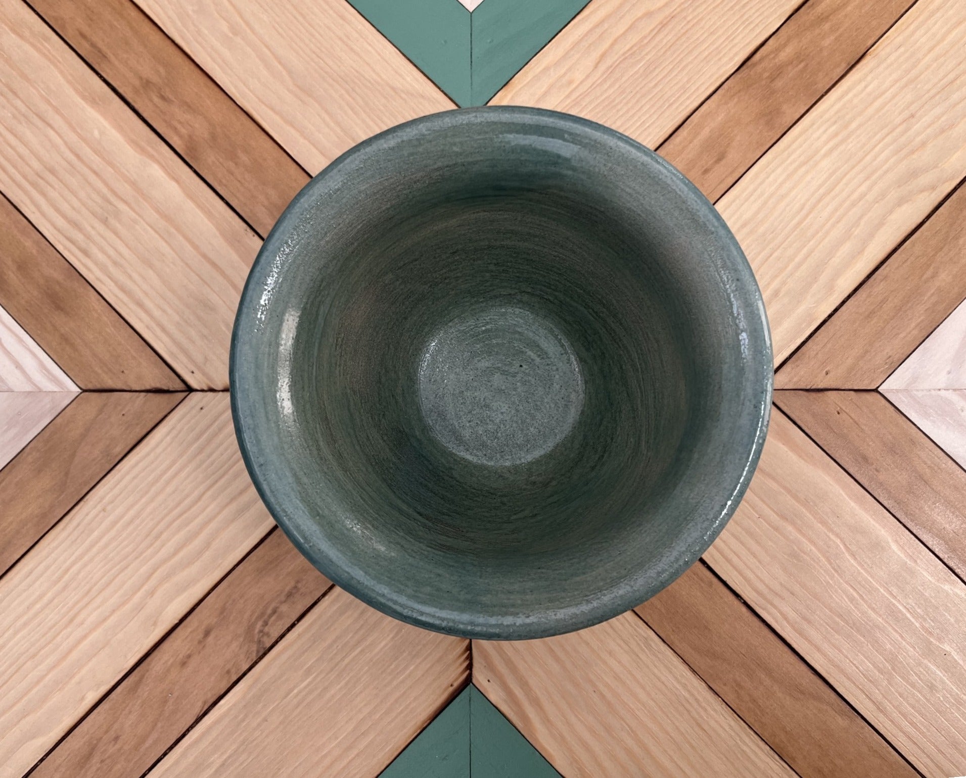Maceta artesanal verde con decoración floral