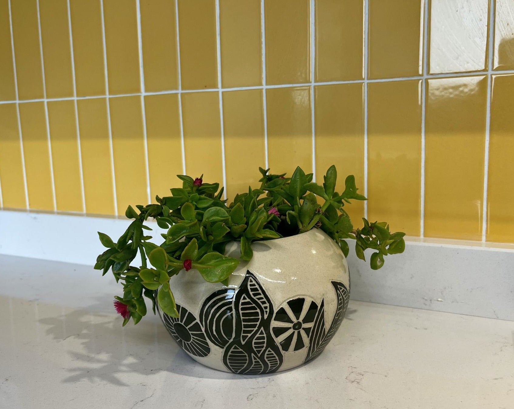 Maceta de cerámica artesanal esgrafiada con motivos floreales